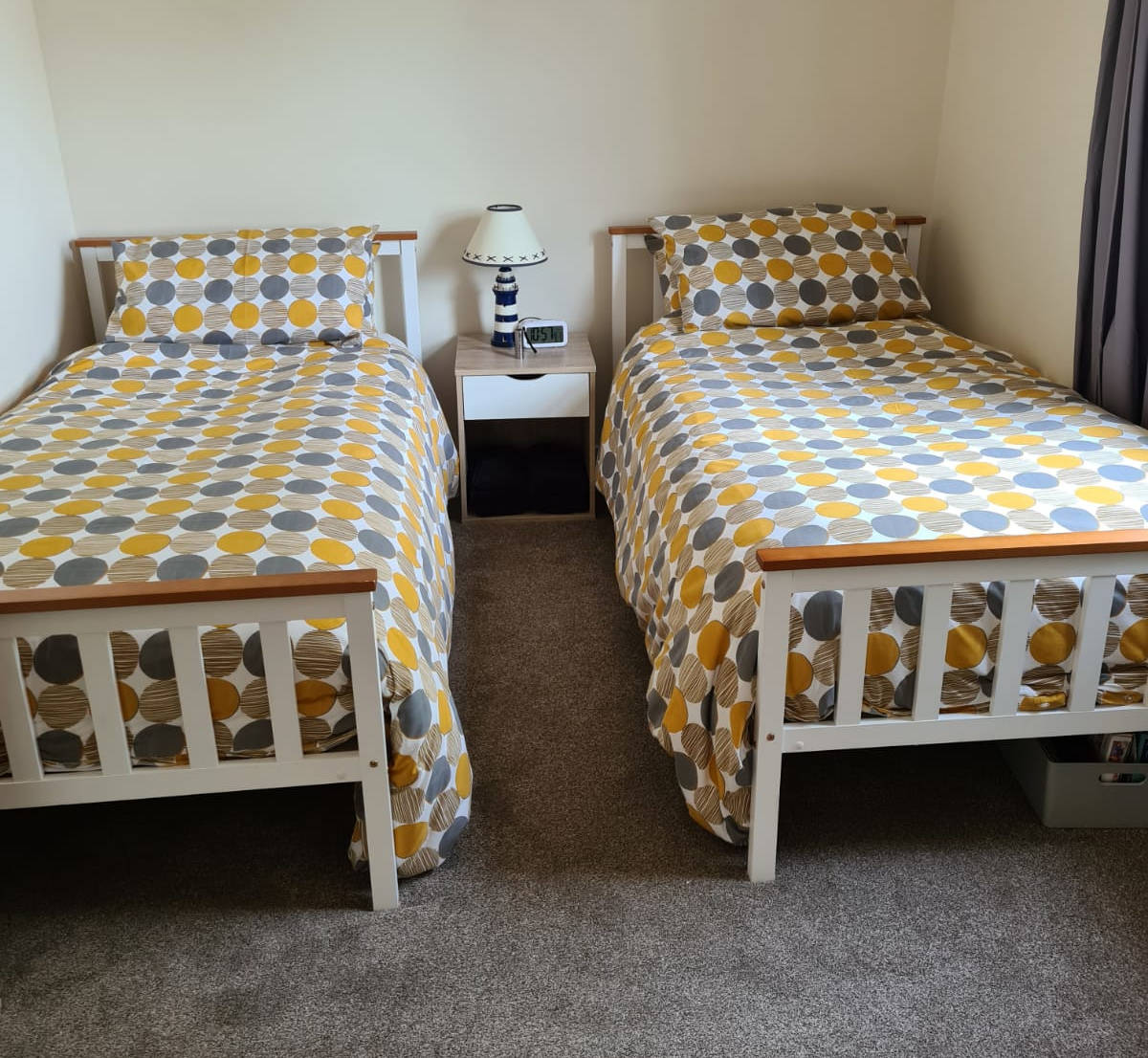 The first bedroom is a twin room with the second bedroom having a double bed. A travel cot and highchair is also available