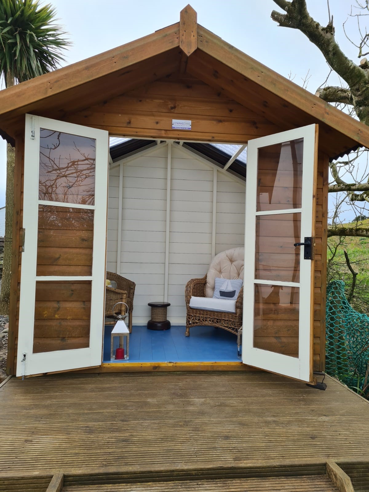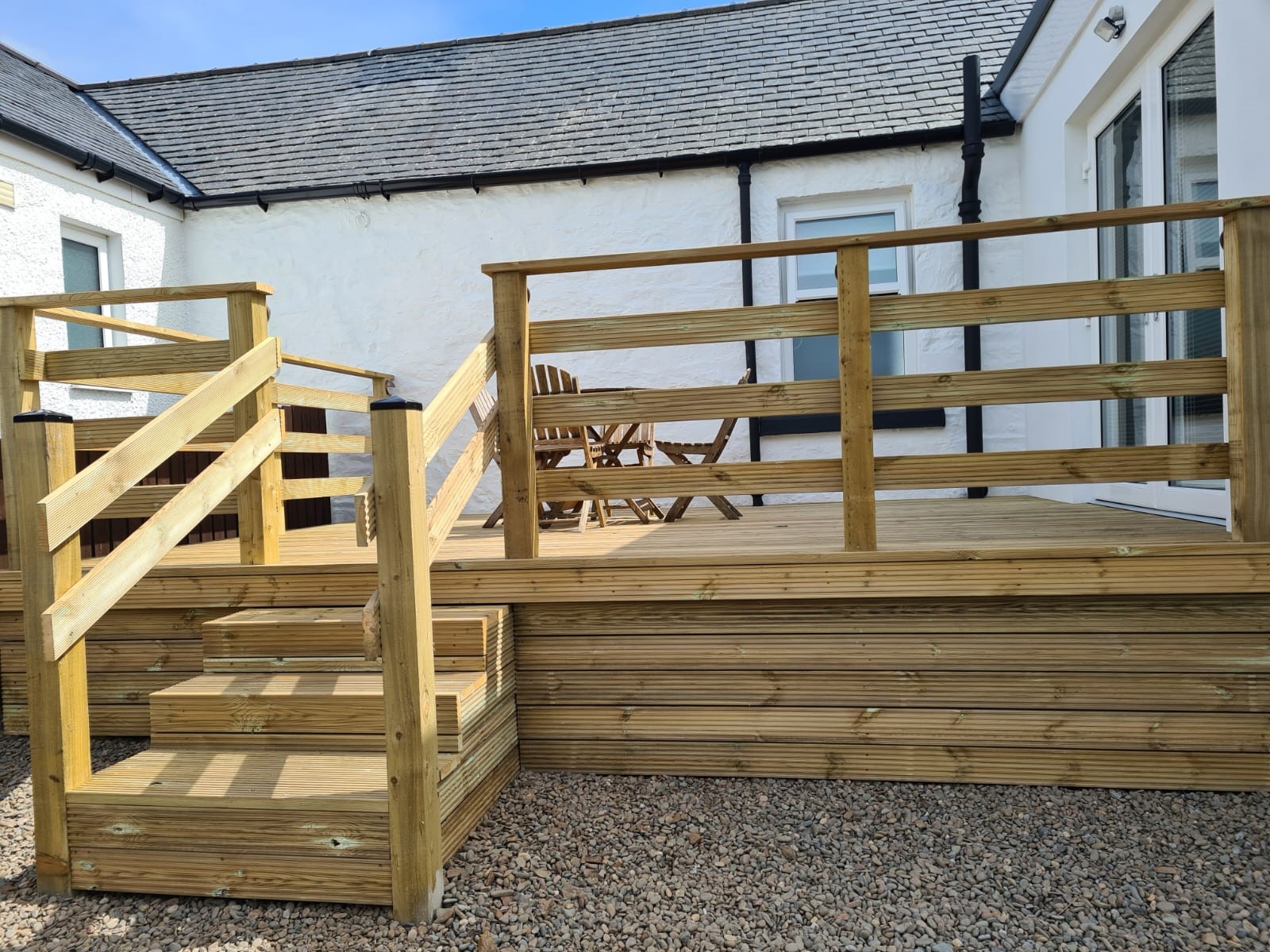 Rawson Cottage comes with a large cottage garden with a stunning sea view. The garden is divided into different parts, including a self-contained Bothy. It has a plethora of shrubs, flowers, pine trees, bamboo, palm trees and a small waterfall with a burn that runs through the garden. There are three tiers to the garden separated by paths and steps, with patios and a large decking area. If you wish to see more of the garden please visit here for more information.