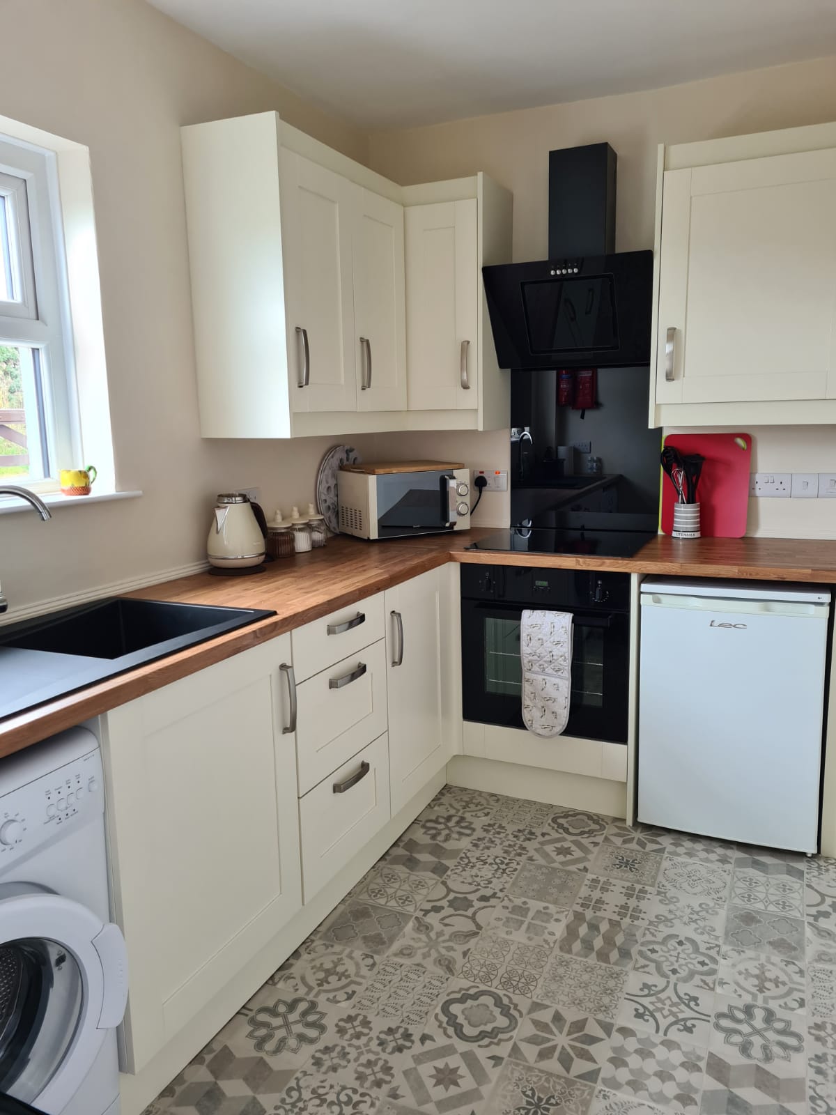 As well as having central heating, you can also snuggle up to the cosy log burner in the good sized living room which has double French doors overlooking the swaying meadows. The kitchen is equipped with everything you need for a self catering holiday, including stove, oven, and a washing machine.
