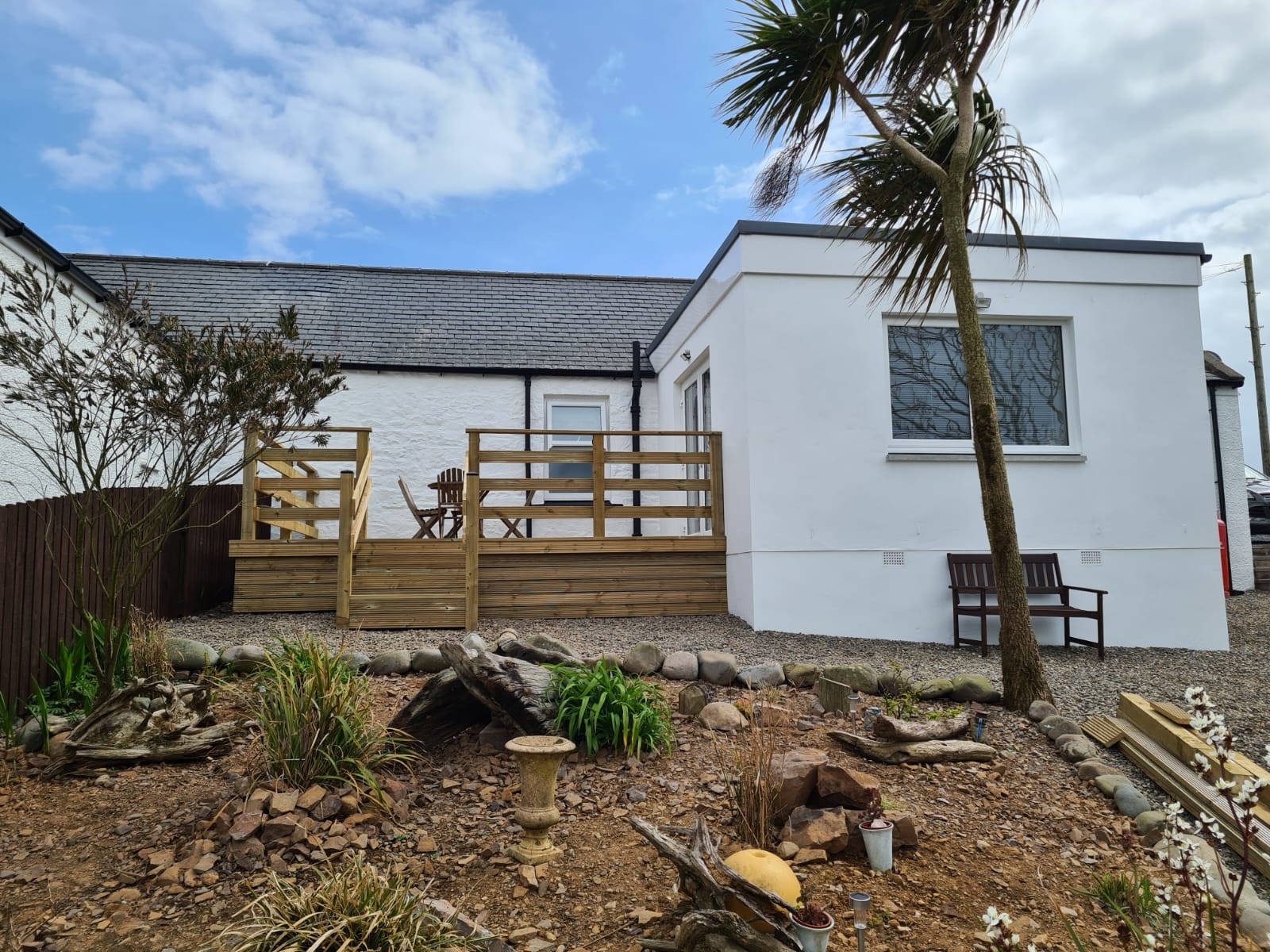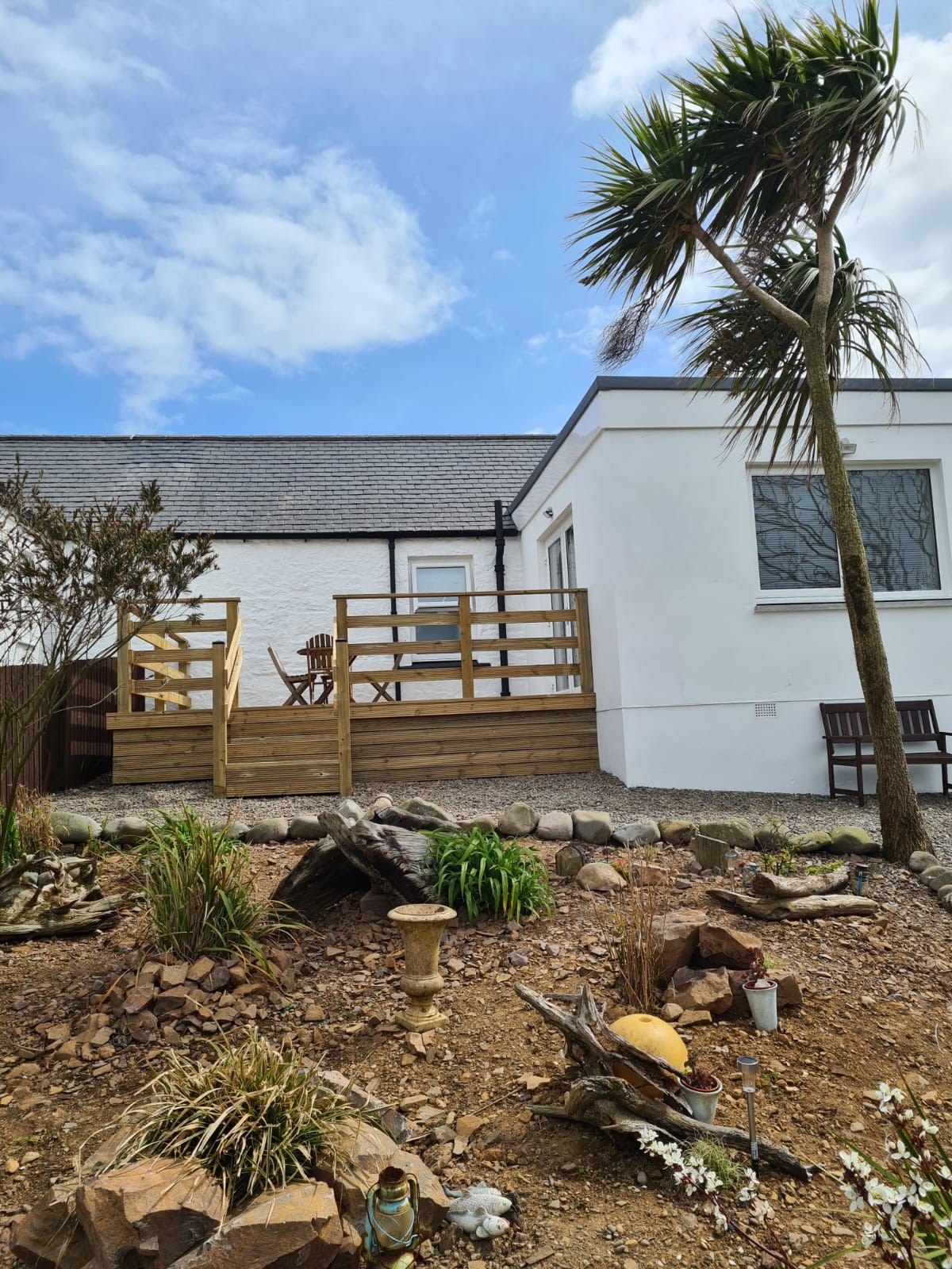 Rawson Cottage comes with a large cottage garden with a stunning sea view. The garden is divided into different parts, including a self-contained Bothy. It has a plethora of shrubs, flowers, pine trees, bamboo, palm trees and a small waterfall with a burn that runs through the garden. There are three tiers to the garden separated by paths and steps, with patios and a large decking area. If you wish to see more of the garden please visit here for more information.